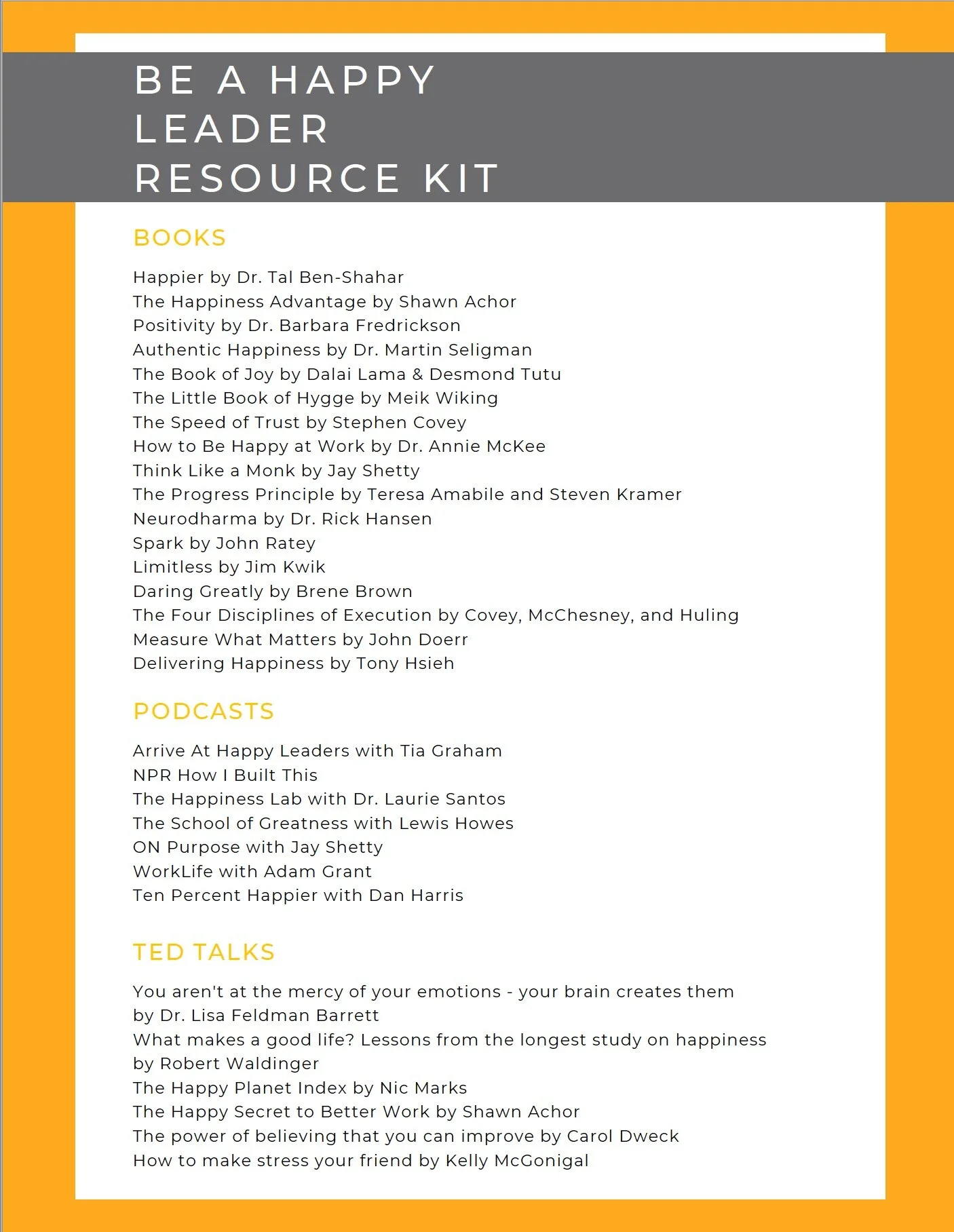 Here are a few of my favorite books, podcasts, and TED talks that complement Be a Happy Leader. If you want more for you and your team, contact me at tia@arriveathappy.com.